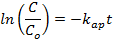 (2)En donde Co es la concentración inicial del contaminante en mol*L-1, C es la concentración del contaminante en mol*L-1 al tiempo t de irradiación en minutos, K es el coeficiente de adsorción de los contaminantes sobre el catalizador en L*mg-1 y kap es la constante aparente de reacción de pseudo primer orden en min-1. Cabe notar que los valores cinéticos obtenidos son los medidos a una longitud de onda de 590 nm, como se explicó anteriormente y corresponden a una dilución de residuos 1:10.