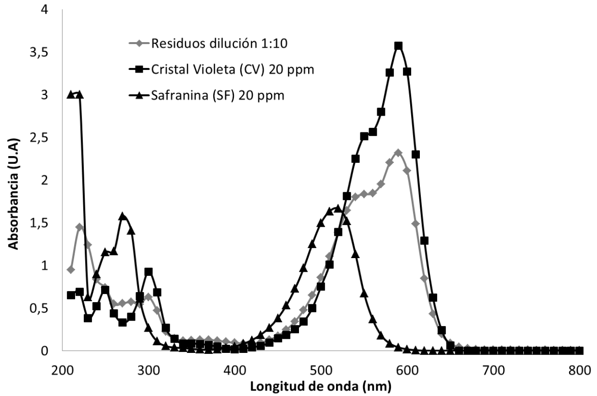 Inicialmente, se procedió a tomar un espectro de absorción de los residuos con el propósito de determinar la longitud de onda adecuada para el seguimiento de la degradación de estos; este espectro se comparó con la absorción de los colorantes Cristal Violeta (CV) y Safranina (SF) presentes en la tinción de Gram (ver Fig. 1).