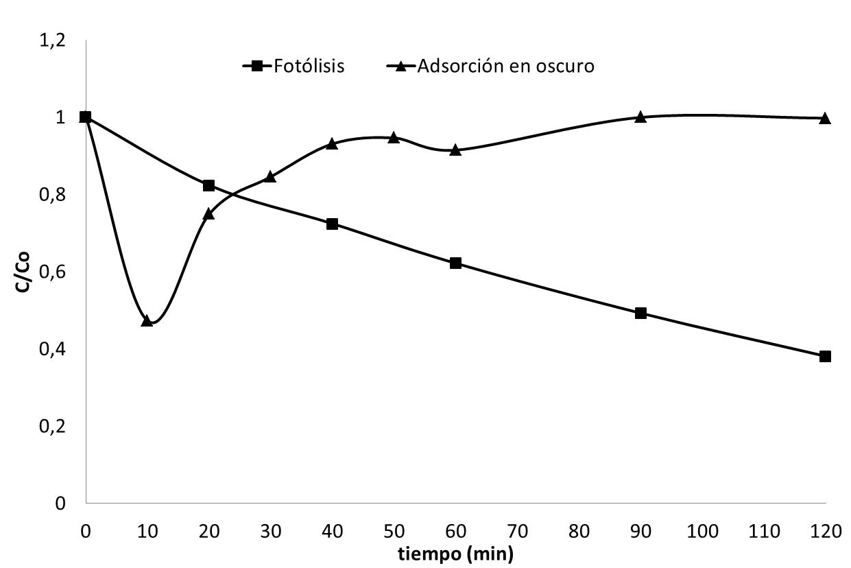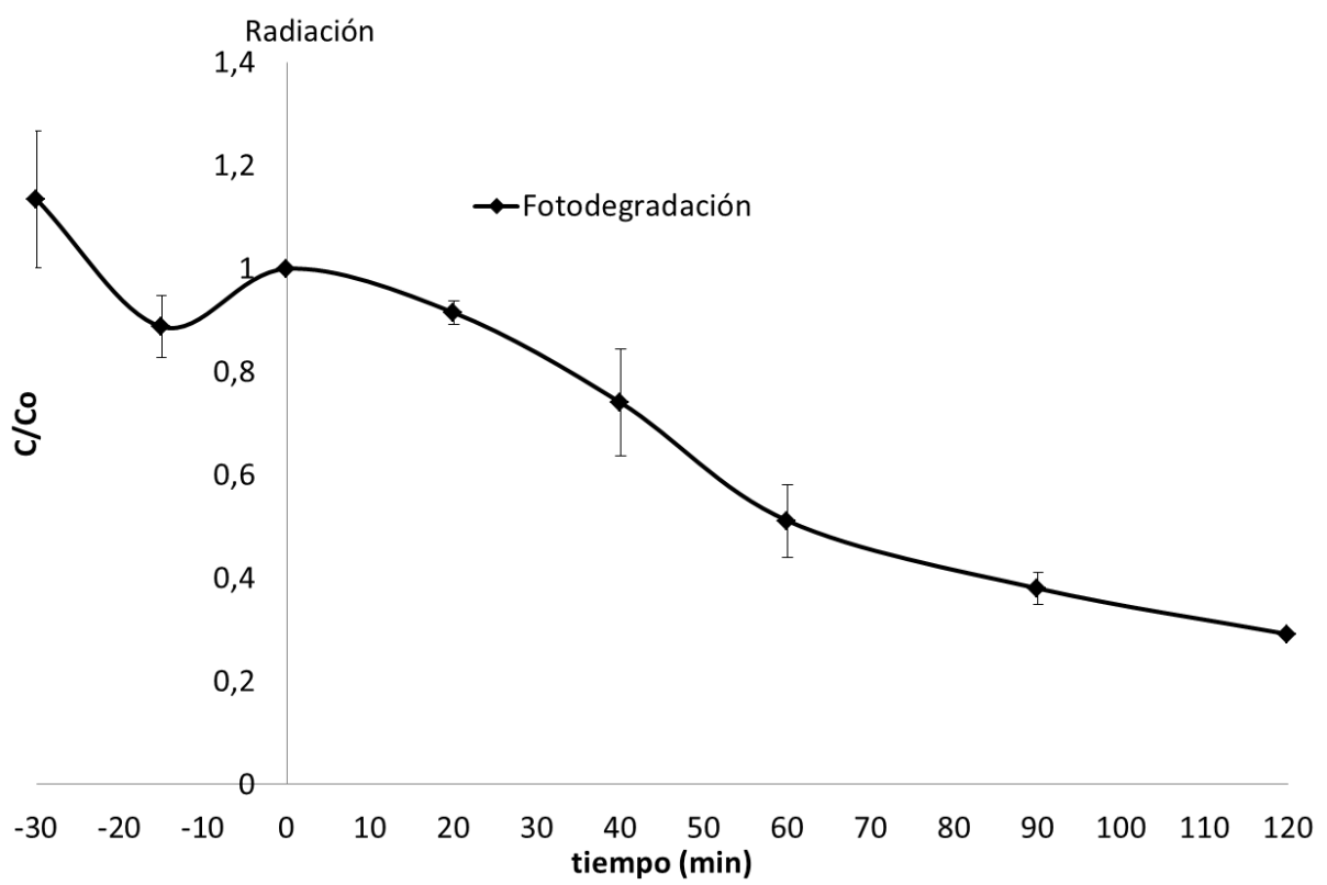 Como se puede observar en las pruebas de absorción en oscuro, dada la disminución inicial de la concentración de los residuos (Fig. 2), se concluye que estos tienen afinidad con el fotocatalizador y por ende se da la adsorción necesaria para la posterior degradación; por otra parte, las pruebas de fotólisis (Fig. 2) muestran una disminución importante de la concentración inicial a la longitud de onda de la medición, sin embargo, esta disminución no es suficiente para degradar de forma adecuada los residuos, ya que tanto para el CV como para la SF de acuerdo con las investigaciones realizadas [12], [13], [14], [15],la aplicación de irradiación únicamente no es suficiente para degradar en su totalidad estos colorantes y se hace más difícil en la matriz tan compleja en la que se encuentran; es por esto que se procedió a realizar las pruebas de fotodegradación, en los residuos diluidos 1:10, los cuales tenían un pH de 6,3 y una dosis de 1 g/l de TiO2 (Fig. 3). La mezcla se dejó homogenizar en oscuro en baño ultrasónico durante 5 minutos, luego se dispuso en el sistema de fotorreacción en oscuro durante 30 minutos para dar tiempo a la interacción de los contaminantes presentes en los residuos con el fotocatalizador, después se procedió nuevamente a medir el pH obteniéndose un valor de 6,2 y se encendió la lámpara de 254 nm durante 2 horas.