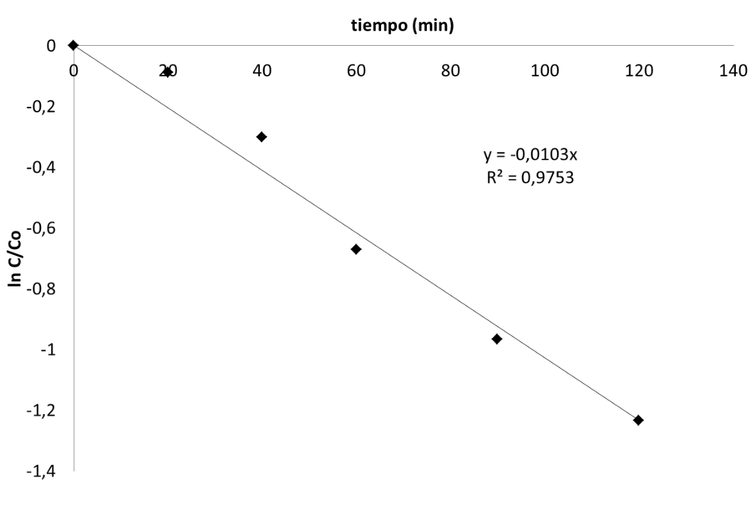 La Fig. 3 muestra el efecto combinado que tiene la luz con el fotocatalizador sobre la degradación de los residuos [12], [13], [14], [15], ya que se alcanzó una remoción del 71 % durante el tiempo de irradiación. Nótese que si la fotodegradación se estima desde las condiciones iniciales, la remoción corresponde al 75 %. Al realizar las mediciones de pH para el sistema se pudo observar una disminución en este parámetro, ya que el pH inicial fue de 6,3, al agregarle el TiO2 y después de homogenizar se obtuvo un pH de 6,2; pero al terminar la reacción, el pH disminuyó hasta 5,4, esto fue debido a las especies generadas durante la reacción. Sin embargo, es necesario hacer análisis más completos para poder determinar si el proceso es viable para una implementación del tratamiento sobre dichos residuos; con este propósito se halló el orden de reacción, encontrando que el mejor ajuste fue el orden 1 (Fig. 4), más específicamente pseudo primer orden (1) que define v como la velocidad de reacción en mol*L-1*min-1, acorde con lo que está reportado en la literatura para las fotodegradaciones con TiO2 como catalizador [6], [7].