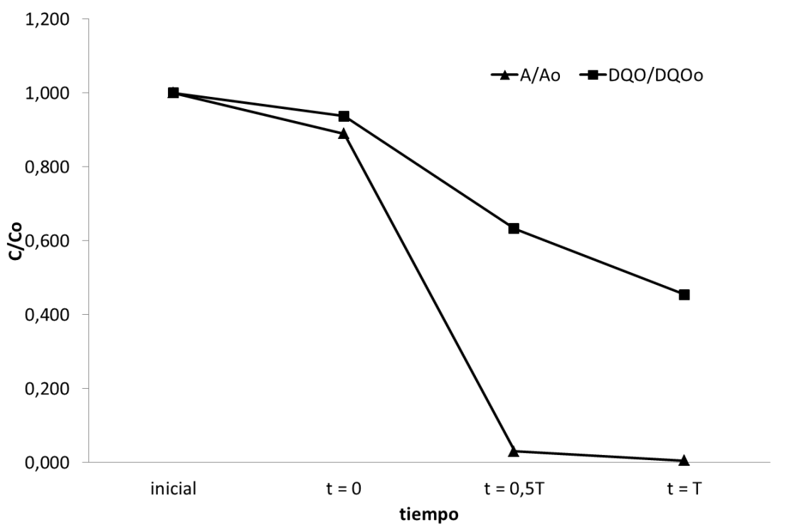 Como se puede apreciar (Fig. 5 y 6), al alcanzar el tiempo denominado 0,5T ya se ha eliminado más del 90 % de la coloración, pero la remoción de la DQO es solo del 40 %, mientras que cuando se alcanza el tiempo T ya se han removido el 99,5 % de la coloración, pero solo un 55 % de la DQO, lo que indica que el sistema se puede implementar, aunque son necesarios mayores tiempos de irradiación para la completa eliminación de los residuos. Se observa también que las especies que absorben a 590nm (principalmente CV) disminuyen notablemente en un tiempo 0,5T mientras se evidencia la presencia de subproductos que no absorben a esa longitud de onda y que aún contribuyen a la carga orgánica.