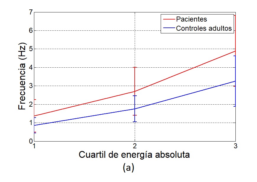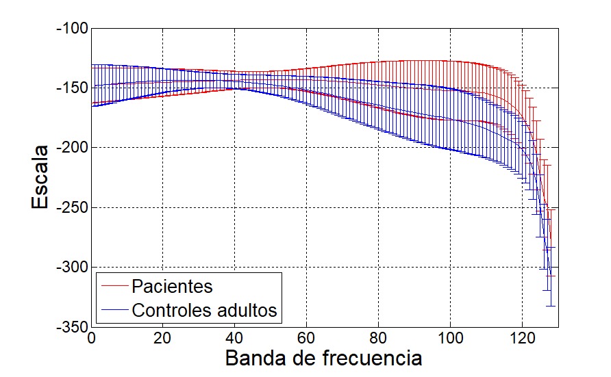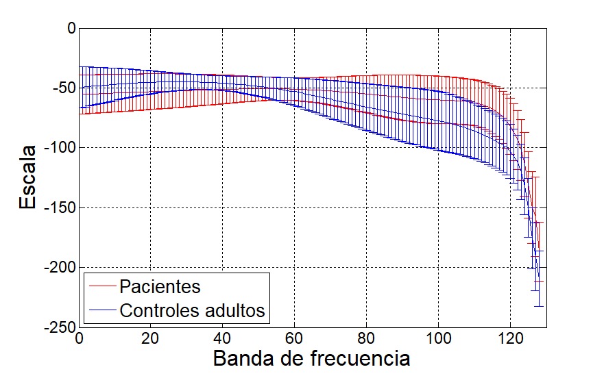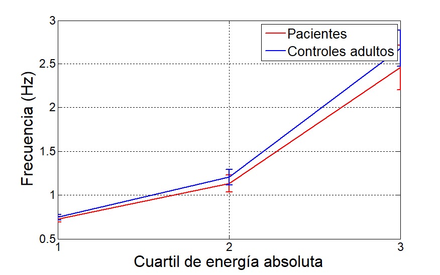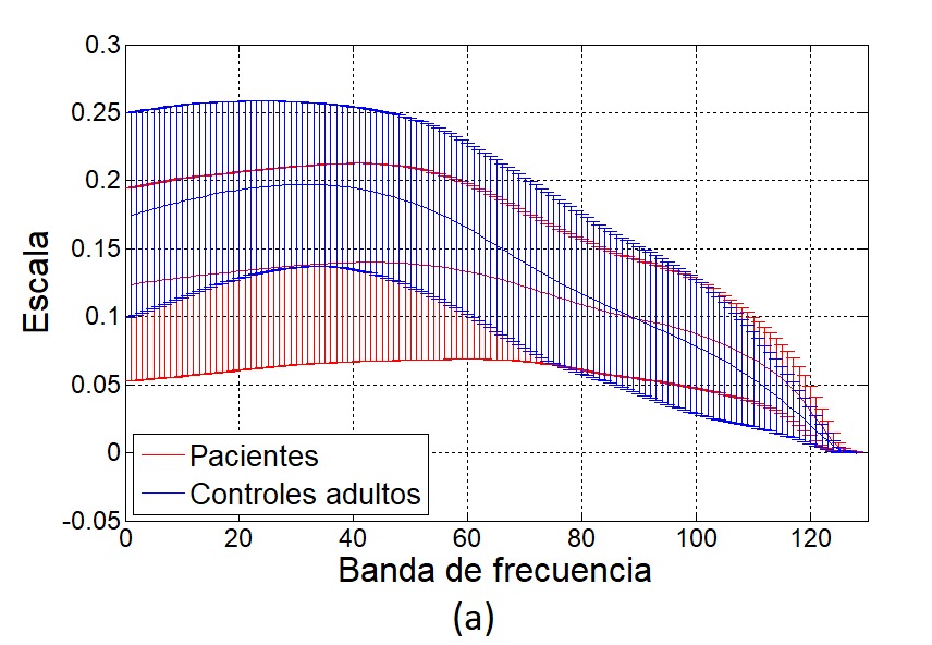 Las Fig. 9 y 10 muestran las envolventes de la entropía espectral por banda de frecuencia. Puede verse que en el análisis del escalograma, las entropías de los controles son mayores en casi todas las bandas, mientras que los escalogramas muestran mayor entropía para los adultos sanos en las bajas frecuencias (alrededor de los 2 Hz). Las envolventes de los centroides espectrales se muestran en la Fig. 11 y Fig. 12, donde se aprecian diferencias notables en ambas representaciones con respecto a la información obtenida al considerarse la STFT o la CWT. Esto puede deberse a la diferencia en resolución de la frecuencia de cada una de las transformadas, aunque se generaliza la obtención del 25 % de la energía por debajo de 1 Hz, 50 % de la energía alrededor de los 2 Hz y el 75 % por debajo de los 6 Hz en ambas representaciones.
