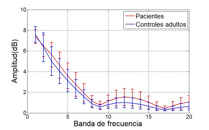 Las medidas calculadas para el clasificador aportan una gran cantidad de información que permite discriminar entre pacientes y jóvenes sanos y entre pacientes y adultos sanos. Para la población joven, los mejores resultados se han obtenido en la tarea del 4x10 y en la población de adultos con la tarea tapping. La Figura 5 muestra la envolvente de la energía absoluta para el ejercicio del tapping en la población en los espectrogramas y la Fig. 6 para los escalogramas. Las gráficas se muestran solamente para el eje X de las señales de aceleración, sin embargo, los resultados son muy similares para todos los ejes.
