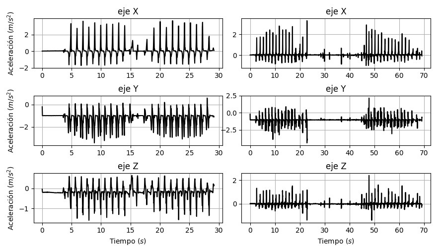 Finalmente, el tercer grupo de sujetos está formado por 37 personas sanas jóvenes, con edades entre los 20 y 42 años, también sin historial de enfermedades neurodegenerativas o desórdenes de movimiento. Las señales de este grupo de personas sanas se adquirieron con el fin de evaluar la influencia de la edad en el problema de clasificación abordado, y en general en los desórdenes de movimiento, que ha sido abordado previamente usado señales de voz [17]. La Tabla 3 contiene información detallada sobre las tres bases de datos utilizadas. Cada participante realiza 3 ejercicios, cuya duración promedio es 35±21s, durante los cuales se capturan las señales de aceleración lineal y angular en los ejes x, y y z para cada uno de los pies del participante.