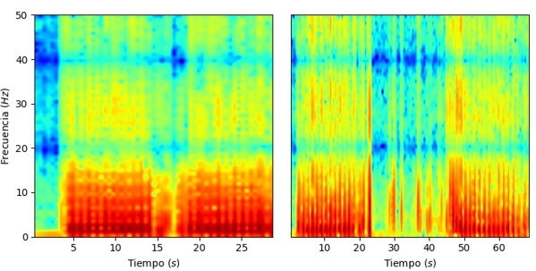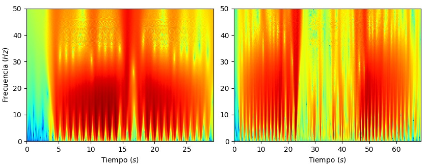 La Fig. 3 muestra la CWT para la misma persona sana y paciente que la Fig. 2. Se puede apreciar el mismo efecto observado en la STFT. En el paciente no es posible distinguir el momento de inicio y fin del movimiento, lo que sí se puede apreciar en la persona sana (izquierda).