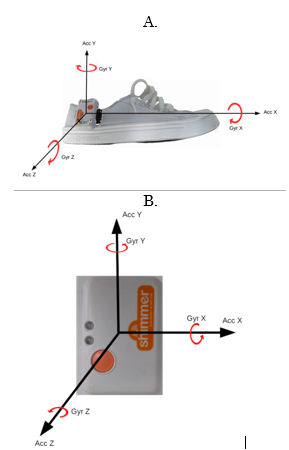 A. Ubicación del sensor en la parte lateral externa del zapato. B. Detalle del sensor utilizado.