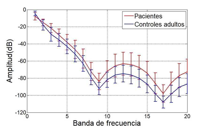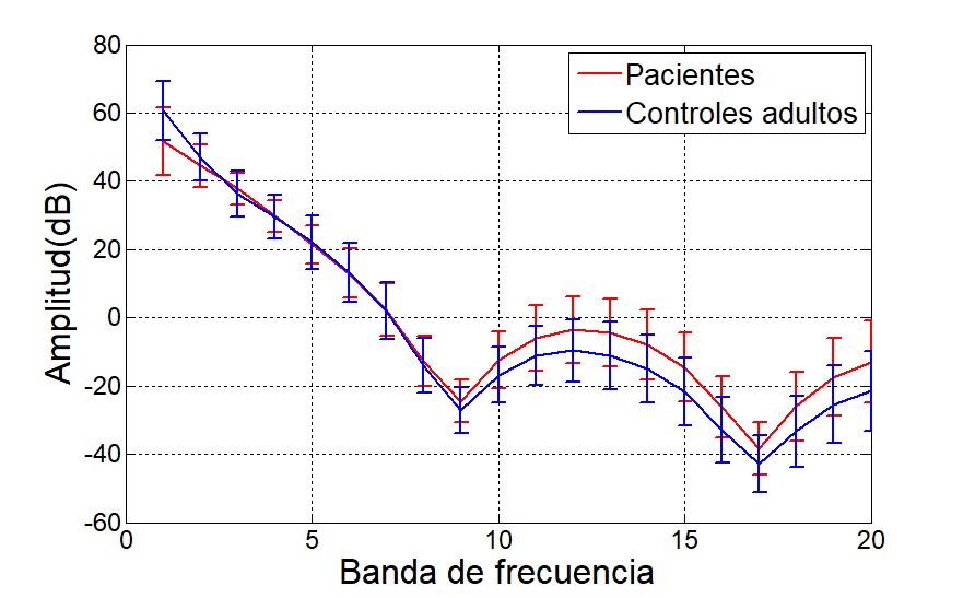 Con respecto a la energía relativa, la Fig. 7 y Fig. 8 muestra la envolvente para el ejercicio del tapping en la misma población. En general el contorno de energía es mayor en los pacientes en las zonas de media y alta frecuencia.