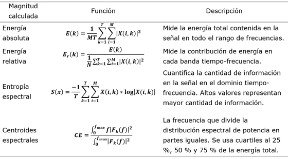 Sobre cada representación tiempo-frecuencia obtenida de la CWT y la STFT, y sobre cada una de las bandas de frecuencia establecidas, se calculan cuatro grupos de características que pueden se observan en la Tabla 2. Las características incluyen la energía absoluta y relativa en cada banda de frecuencia, la entropía espectral, y tres centroides espectrales. Cada característica es calculada sobre cada uno de los seis ejes de los sensores inerciales utilizados (acelerómetro de 3 ejes y giróscopo de 3 ejes).