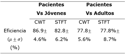 La Tabla 6 muestra el promedio aritmético de la eficiencia del clasificador con las diferentes tareas y características que se han implementado. Puede notarse que, en términos generales, el mejor resultado se obtiene con la CWT en la población joven.