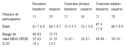 El segundo grupo de sujetos está formado por personas sanas con edades similares a las de los pacientes (21 hombres con edad promedio de 67.4 años y 18 mujeres con edad promedio de 60.5 años). Ninguno de los controles tiene historia de enfermedades neurodegenerativas, o algún otro desorden de movimiento.