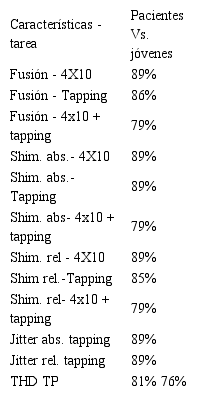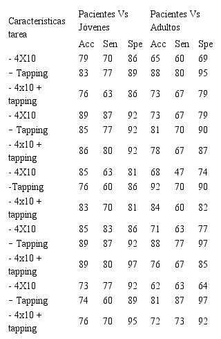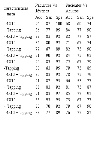 Los resultados de la clasificación mostrados en la Tabla 4 describen el porcentaje de acierto, sensibilidad y especificidad que se realiza la clasificación entre pacientes y personas sanas jóvenes, y entre pacientes y personas sanas adultos usando las características tiempo frecuencia a partir de la STFT. Cuando se considera la fusión de todas las características, los mejores resultados en la población de jóvenes se consiguen con el ejercicio 4x10 (89 %), mientras que en la población de adultos se consiguen con el ejercicio tapping en ambos pies (88 %).