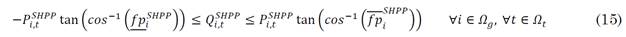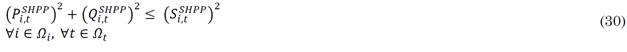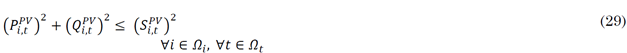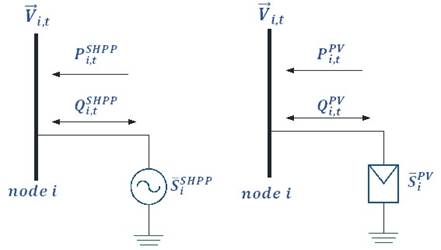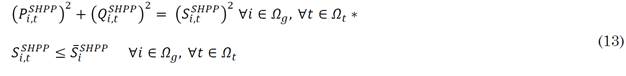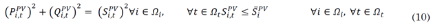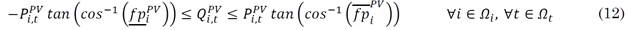 must not exceed the maximum power defined at node 𝑖 for distributed generation. In (11) and (14) the generated power must be positive, and (12) and (15) the limits of the maximum and minimum power factor of the SHPPs and the inverters that connect the PV generators to the DS.