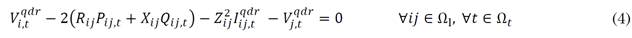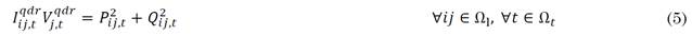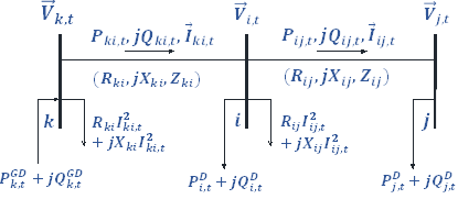 The optimization model is subject to the operation of the DS in Fig. 1. Therefore, (2) and (3) mathematically describe the active and reactive power balance in each node, (4) formulate Kirchhoff’s second law (the net electromotive force around a closed circuit loop is equal to the sum of potential drops around the loop), and (5) presents the relation among voltages, currents and powers [17].