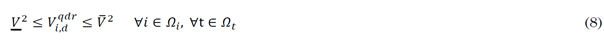 The operation of the system is subject to the non-negative values of the voltage and current magnitude (6) and (7), to the restriction of maximum and minimum voltage magnitude at nodes, and to the maximum current the conductors of the existing distribution networks (8) and (9) can withstand.