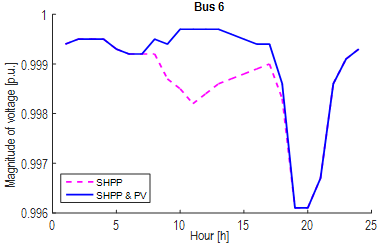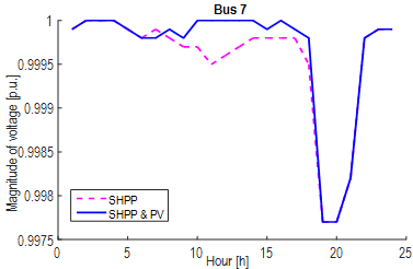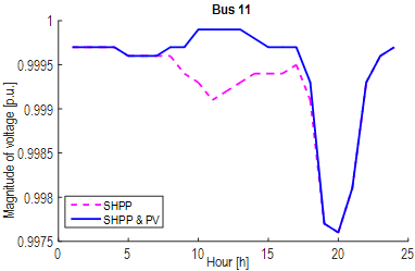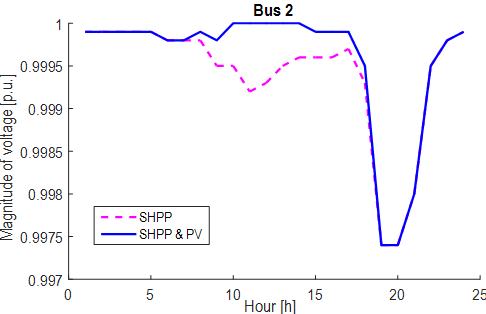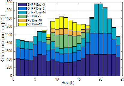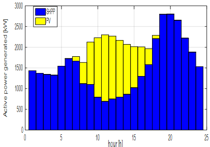 Fig. 10 shows the optimal daily generation of active power with SHPPs and PVs, where PV generation participates in the power supply between 6 a.m. and 6 p.m. (which corresponds to the highest range of the solar irradiation curve in this area), without an important impact on the peak demand.