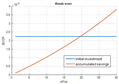 Figure 13 shows an initial investment of 224.000 million COP that includes civil works, the cost of the panels and inverters, transport and construction. The savings that result from the difference between the costs of the energy generated by the SHPPs (2,357 COP/kWh) and PVs (276 COP/kWh), plus savings due to reduced losses (14,528 COP/kWh), enable to recover the investment in 20 years.