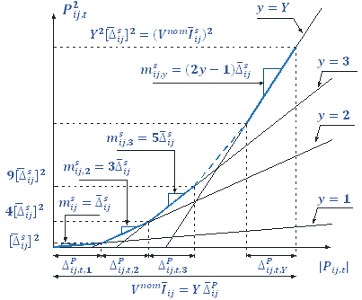 The relation among voltages, currents and powers in (5) may be linearized through discretization blocs. Fig. 3 shows the way a non-linear function can be expressed using several lines 𝑌 of different slope, and that the accuracy of the function varies depending on the number of the discretization (the value that 𝑌 adopts). Then, (5) is defined by means of an additional number of linear constraints and continuous variables, as shown in (17)-(28) [18].