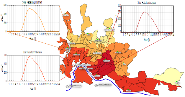 The maximum power and performance of the PV generator depend on the solar irradiation of the region or area where it will be installed. The solar radiation curves data were taken from the database of the National University of Colombia for the year 2017; they were obtained from weather stations located in three different neighborhoods in Manizales, Colombia (namely, El Carmen, Aranjuez and Villamaría). To each system node, indicated in Fig 5, the nearest solar radiation curve is assigned, according to Fig. 4.