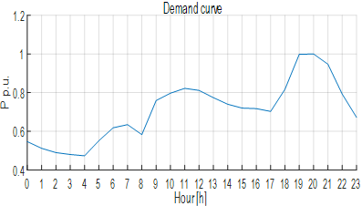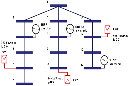 The Proposed programming model is implemented in a mini-isolated network where all the nodes are possible candidates for the installation of PVs sources of any power. The isolated mini-grid operates at a nominal voltage at the distribution level (13.2kV), with a radial configuration, where the main power sources and consumers are connected through the distribution substations. The mini-grid implemented in this work consists of three SHPPs (Intermediate, Municipal and Sancancio) located in three nodes (3, 8, and 14, respectively). The capacity of the Intermediate and the Municipal SHPPs is 1 MW each and Sancancio’s reaches 2 MW; thus, the total generation capacity of this mini-grid is 4 MW. Fig. 5 presents the simplified one-line diagram of the study case. The system load is modelled through a typical demand curve of the average demand in the isolated mini-grid. In turn, Fig. 6 shows demand peaks between 10 a.m. and 12 p.m. and 6:30 p.m. and 8:30 p.m. because they are the time ranges with highest consumption in the system.