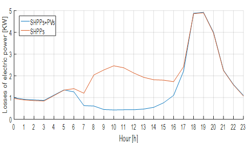 Fig. 8 shows a comparison of the system’s operation before and after the implementation of the PV generators. It can be seen that technical losses of electric power in the system are lower in the presence of PVs, a reduction of approximately 30%, between 6 a.m. and 5 p.m.