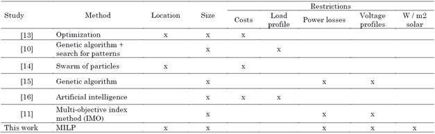 Currently, different studies address the problem of integrating PV generation into NIZ. Table 1 shows different works with techniques and optimization methods to determine the size and location of PVs sources. Some have taken into account the financial variables of the system, such as marginal prices due to location and congestion income, and prices and profitability of the PV with an annual flat rate of energy. Others have considered the load profile, power losses and voltage profiles of the electrical system.