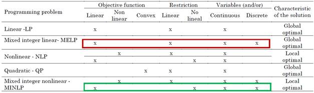 Different optimization problems are classified by the nature of the objective function, the constraints and the variables that are part of the programming model [12]. Thus, the nature of an objective function can be linear, convex or non-linear; in the case of constraints, they can be linear, non-linear or have no restrictions; and their variables can be continuous or discrete. Table 2 lists different programming problems.