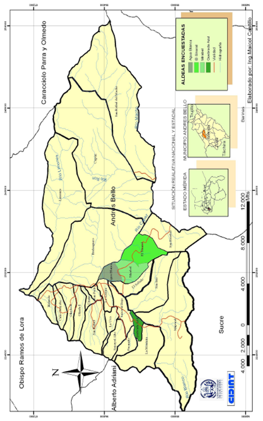 La zona en estudio (Figura 1) es parte de la cuenca del río Capáz, municipio Andrés Bello del estado Mérida, al occidente de Venezuela, y está constituida por las aldeas Quebrada Azul, Agua Blanca, Sinaral y Mirabel.
