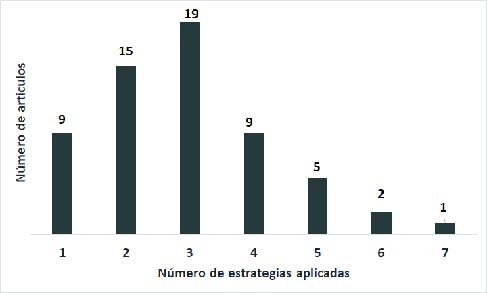 En 9 artículos se descubre una sola estrategia: solo muestran fragmentos de transcripciones de entrevistas o registros de observaciones (10, 11, 17, 27, 35 y 55); solo realizan una descripción detallada del contexto o sujetos (6 y 19); o solo recurren a otros investigadores (9). En el otro extremo, 8 artículos muestran entre 5 y 7 estrategias (5, 25, 26, 31, 39, 40, 58, 59).