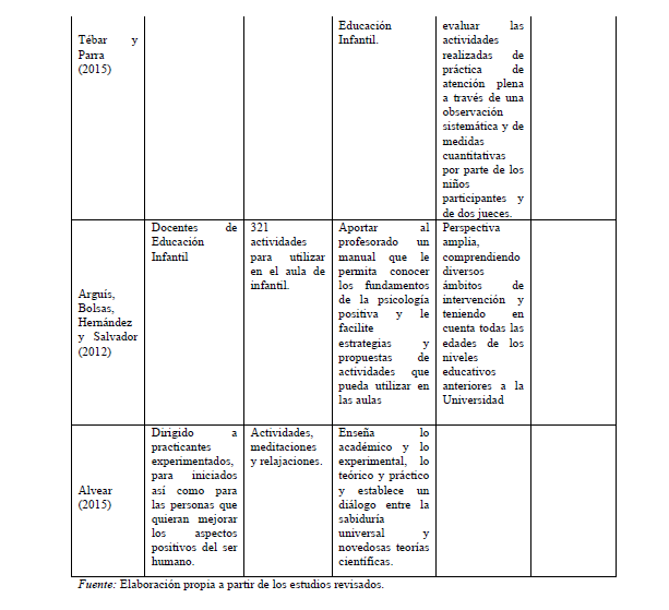 En cuanto a los estudios revisados sobre la práctica de la atención plena en el ámbito de la Educación Infantil, los resultados indican que la mayoría se centran en el diseño de programas o propuestas de intervención para promover la educación emocional en el aula, a través del Mindfulness (ver tabla 2).