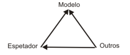 Contudo, procurou mostrar-se neste artigo que a este género de publicidade se seguiu uma publicidade que, no início do século XX, era designada por “emocional” ou “atmosférica”, isto é, centrada no desejo envolvido nas interações sociais e apelando a qualidade intangíveis, “atmosféricas”, como o estilo prestigioso. Nesse tipo de anúncio, a mensagem publicitária veicula a ideia de que, ao consumir o que o modelo consome, o espetador será objeto da mesma admiração por parte dos outros de que o modelo, ele próprio, é objeto. É uma estrutura triangular ilustrada na Fig. 10.
