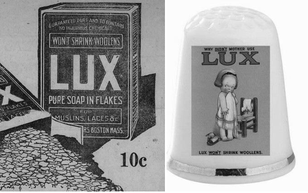 A Lever Brothers foi criada em Inglaterra, em 1851, como mais uma das lojas destinadas a vender produtos a granel. Em 1885, a empresa lançou a sua primeira barra de sabão com marca, Sunlight Soap, a que se seguiu o seu primeiro grande sucesso comercial, o sabão Lifeuoy. Em 1900 foi lançado, primeiro em Inglaterra depois nos Estados Unidos, o sabão Lux. A originalidade deste produto consistia em ser uma forma de sabão em pó proposta como uma vantajosa alternativa ao tradicional sabão em barra. A Lever propôs Lux como uma marca que distinguia o seu produto dos sabões genéricos, comercializando-o em embalagens standard e com o nome bem destacado no anúncio. A proposta – portanto, a utilidade – associada ao produto consistia, inicialmente, em afirmar que a lavagem com Lux não fazia encolher as lãs (cf. Fig. 3: “Lux won't shrink woollens”).[2]
