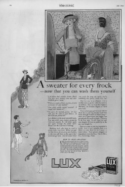 Sempre graças aos esforços da J. Walter Thompson, a partir da segunda década do século XX Lux deixou de estar centrado apenas na utilidade e começou a ficar associado a estilos de vida dispendiosos, sendo também associado às mulheres que, nos Estados Unidos, começavam a aderir às novas tendências da moda assentes em vestidos simples de inspiração desportiva. Essas mulheres trocavam frequentemente de roupa, e a sua lavagem com Lux permitia a sua preservação (cf. Fig. 5).