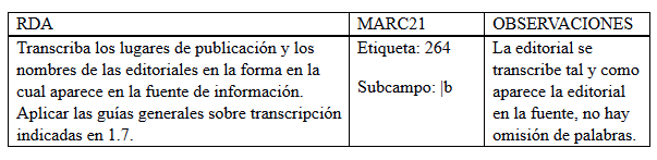 Se unificaron todos los registros a una misma forma del nombre de la editorial, sin embargo, a partir de la introducción de RDA se transcriben tal y como aparecen, como se indica.