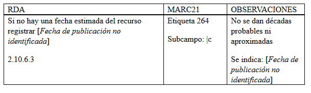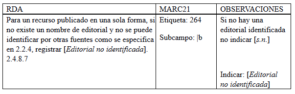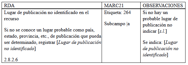 Anteriormente se utilizaba la etiqueta 260, sin embargo, para detallar y relacionar los datos de publicación se utiliza la etiqueta 264. Todos los registros que no tenían un lugar de publicación identificado se modificaron a “[Lugar de publicación no identificado]”.
