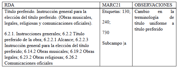 En este caso se han utilizado los títulos preferidos para la Biblia, obras legales y para las obras clásicas y completas. Con RDA, los títulos específicos de los libros de la Biblia se proporcionan de manera directa, sin subordinación al testamento correspondiente. En el caso de las obras completas de autores de la literatura se agregó la etiqueta 240, con el título preferido Obras (García López, Mejía Ruiz, Ramos Díaz & Guzmán Rodríguez, E. M., 2012, p. 44).