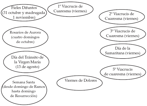 El ciclo anual está fundado en la reactualización de la mitología cristiana que abarca los momentos festivos que rememoran la vida de Cristo (de acuerdo con la liturgia canónica católica) y sucesos bíblicos cristianos, y las celebraciones de los Santos y de las fiestas locales. No en todas las conmemoraciones rituales del ciclo interviene el Apostolado, por lo cual nos centraremos en aquellas donde esta figura social tiene presencia. Estos momentos rituales son los siguientes: