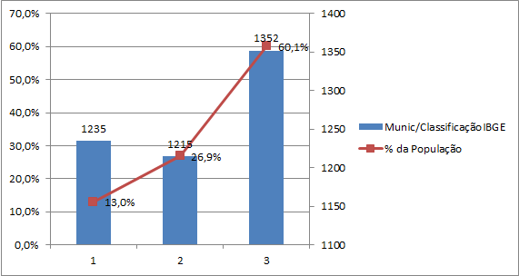 De forma geral, ao analisar a Figura 3, nota-se que o quantitativo de municípios categorizados como “1”, “2” e “3” são bastantes próximos uns dos outros (1235, 1215 e 1352, respectivamente), entretanto, o quantitativo populacional que eles concentram é bastante divergente (13% categoria “1”, 26,9% classe “2” e 60,1% classificação “3”, desse universo).