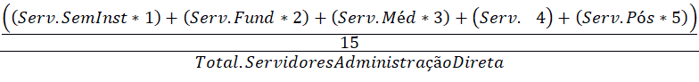 Cabe explicitar, portanto, que este último coeficiente, denominado “média ponderada da capacitação total dos servidores dividido pela quantidade de servidores da administração direta total”, trata-se de um fator resultante da média aritmética ponderada dos quantitativos de servidores aplicados a pesos de acordo com a formação. Em seguida, dividiu-se esse número pelo quantitativo de servidor da administração direta do município, conforme fórmula a seguir: