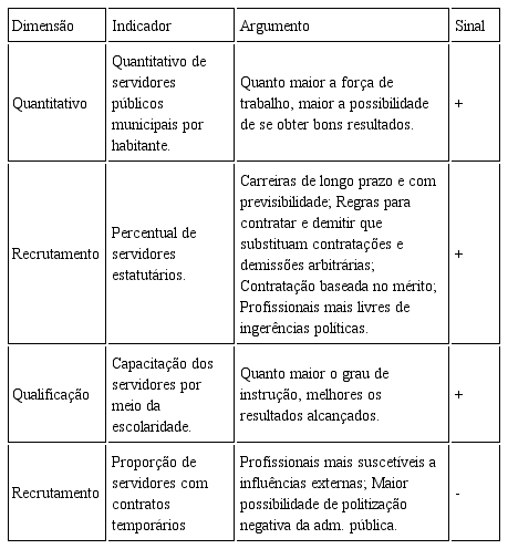 A capacidade técnico-administrativa do município é operacionalizada por meio de quatro dimensões relacionadas aos critérios burocráticos weberianos típicos, os quais funcionaram como proxy para qualidade da burocracia.