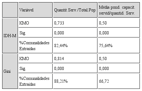 Assim, de forma sucinta, inicialmente foi feita uma redução das dimensões das variáveis relativas à quantidade de servidores por habitante e a capacitação dos servidores municipais, utilizando-se da Análise Fatorial. Em seguida, foram rodadas as Correlações e Regressões Logísticas Binárias, utilizando-se dos fatores extraídos, numa tentativa de explicar o resultado municipal relativo ao IDH-M e Gini obtidos em 2010.