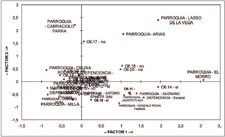Se pudo observar (ver gráf. 6) que las infraestructuras de las instituciones de las parroquias Arias, Lasso de la Vega y el Morro, sin importar la dependencia en que laboran los docentes: (O6.17) no poseen pasillos amplios; (O6.18) las escaleras no se encuentran en buen estado; (O6.20) la extensión de los patios de recreo no es adecuada para la población que albergan. Por otra parte, la infraestructura de las instituciones estadales ubicadas en las parroquias Jacinto Plaza, el Sagrario y Gonzalo Picón Febres: (O6.11) se observan ventanas sin protección; (O6.12) se observan escritorios y pupitres ubicados cerca de ventanales de vidrio o de estantes altos; (O6.14) se observan extintores colocados en áreas inadecuadas y no asegurados; (O6.18) las escaleras se encuentran en buen estado.