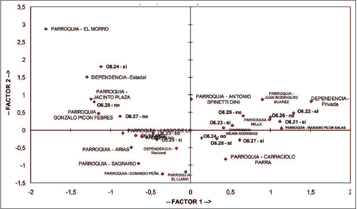 En cambio en las instituciones dependientes del estado, ubicadas en las parroquias Jacinto Plaza, El Morro y Lasso de la Vega los resultados fueron los siguientes: (O6.2) sí hay objetos colgantes como mapas, placas, adornos, relojes, diplomas por encima del nivel de la cabeza de los niños (as) no asegurados adecuadamente a la pared; (O6.3) sí se observan luorescentes, materos, cielo raso y lámparas sin soportes adecuados; (O6.4) la escuela no cuenta con equipos de emergencia: extintores, caja de primeros auxilios, entre otros.
