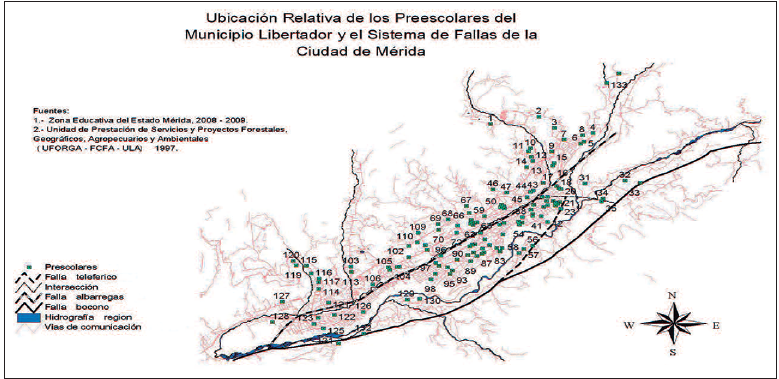 Por último, se generó un mapa con ayuda del programa ArcView Gis versión 3.3, así como la ubicación relava de las 134 instituciones que imparten educación preescolar, según la Zona Educativa del estado Mérida (2008-2009), y un mapa con la ubicación relativa de los sistemas de fallas que atraviesan la ciudad de Mérida. Una vez ubicadas las diferentes instituciones dentro del mapa, se solaparon las diferentes fallas que presenta la ciudad de Mérida, lo que permitió corroborar la vulnerabilidad ante un evento sísmico de la población en estudio, así como también enfatizar sobre cuáles pueden ser más vulnerables, según su ubicación geográica con respecto al sistema de fallas (ver tabla 4, fig. 2).