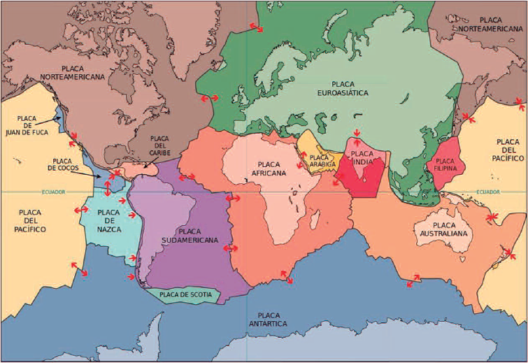 Ambos, Wicander y Monroe, hacen mención al hecho de que la “Tectónica de Placas” ha proporcionado un marco para interpretar la composición, estructura y procesos internos de la tierra a escala global (ver Fig. 4), conduciendo a su vez al convencimiento de que los continentes y las cuencas de los océanos son parte de un sistema litosfera–atmosfera–hidrosfera que evolucionó junto con el interior de la tierra. La tectónica de placas es el nombre que se le da al modelo de la supericie de la tierra que expone cómo dichas placas se desplazan unas respecto de otras produciendo elevaciones, fallas, volcanes, mares y, claro está, los terremotos.