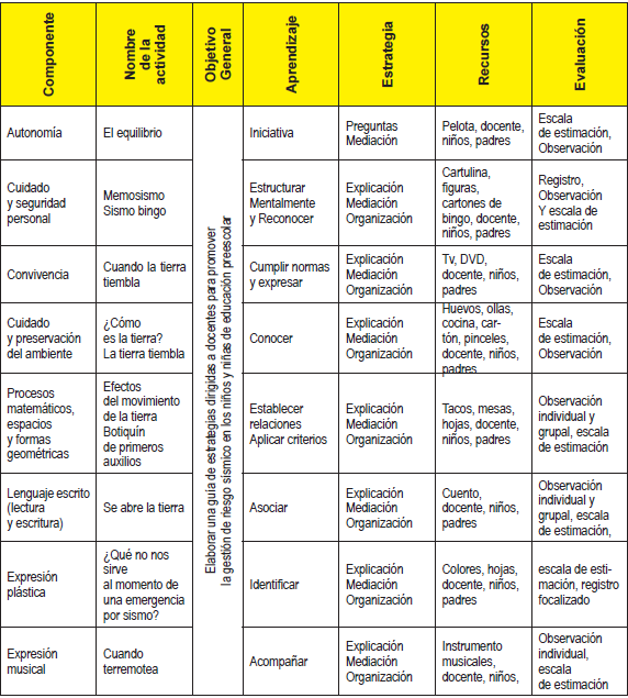 En este sentido se convierte en un instrumento esencial para la efectiva inserción del tema prevención sísmica en el ámbito escolar, ya que éste engasta en su área de formación personal y social, que hace referencia al derecho que tiene el niño a la seguridad, a la conf ianza en sus capacidades y en su componente cuidado y de seguridad personal. Esta área toma en consideración el conocimiento y la aplicación de medidas de seguridad que permitan prevenir situaciones de riesgo para preservar la salud y la integridad física.