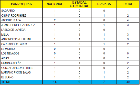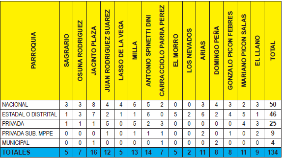 La población objeto de estudio estuvo conformada por un grupo de 134 instituciones educativas, distribuidas en 15 parroquias ubicadas en el municipio Libertador del estado Mérida (ver tabla 2). Para la selección de la muestra se realizó una estratiicación por dependencia (nacional, estadal, privada, privada-subvmppe, municipal) de las diferentes instituciones que imparten el nivel Preescolar, ubicadas dentro del Municipio Libertador, siendo las dependencias nacionales, estadales y privadas las de mayor proporción en el número de instituciones, éstas fueron utilizadas para la selección de la muestra dentro de las diferentes parroquias que conforman el municipio, por tanto, dicha muestra llego a estar representada por 30 instituciones educativas (ver tabla 3).