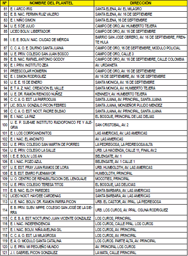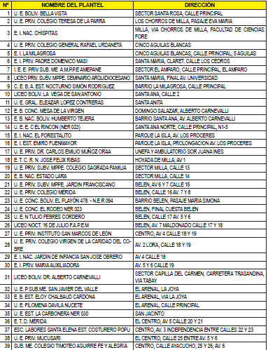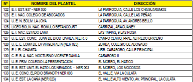 Al mismo tiempo, en las instituciones educativas ubicadas en las parroquias Domingo Peña y Gonzalo Picón, cuya dependencia es Nacional, (O6.1) se observan estantes, archivadores, bibliotecas no asegurados a la pared; (O6.7) sí se observan recipientes de vidrio; (O6.10) no se observan sistemas automáticos de iluminación de emergencia.