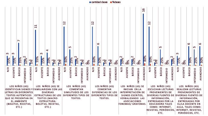 La dimensión: Iniciación y desarrollo de los procesos de lectura, alcanza mayores niveles de logro cuando las actividades se dirigen a procesos de decodificación, o cuando los niños y niñas deben realizar lecturas, alcanzando 80% de logro en el nivel avanzado. Es decir, se desarrollan de manera individual, interpretando signos y letras, asociando fonemas/grafemas, realizando lecturas, etc. Sin embargo, los espacios para realizar actividades en que los niños y niñas pueden comentar y generar una conversación grupal son escasos, comprendiendo que el porcentaje de no observados varían entre el 15% y 60%, alcanzando mayores valores porcentuales aquellas experiencias individuales relacionadas con la lectura.