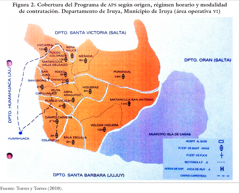La figura 2 ilustra la implementación del dispositivo en el departamento de Iruya, parte de nuestra zona de estudio. Allí pueden observarse los caminos con acceso carretero, la localización del hospital y la distancia en horas desde este a los puestos sanitarios que cubrían a las distintas comunidades en el año 2008.