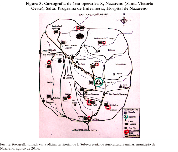 En la figura 3, al igual que en la anterior, puede observarse la disposición de puestos sanitarios en conexión con el hospital central, con el objetivo de cubrir la totalidad de la extensión de Nazareno. Un grupo de agentes sanitarios formado en el programa también fue capacitado por la Prelatura de Humahuaca, provincia de Jujuy, con injerencia religiosa en los departamentos de Santa Victoria e Iruya. Cabe destacar que la Prelatura fue creada en 1969, a través de una bula papal. Concebida a modo de diócesis, con autonomía y bajo las órdenes de un Obispo —en ese momento era Márquez Bernal—, la jurisdicción eclesiástica abarcaba la Quebrada de Humahuaca y Puna de Jujuy. A partir de 1972, dicha jurisdicción se amplió para incluir los departamentos salteños de Santa Victoria e Iruya (Olmedo Rivero, 2004).